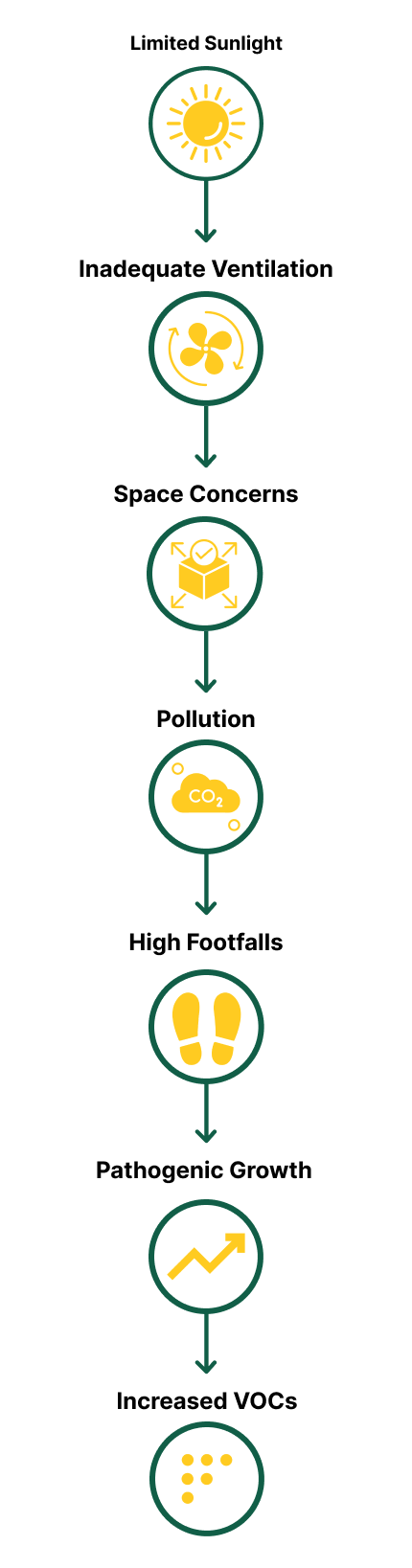The contaminants from the work floor and air duct are added to the indoor air during cooling. These contaminants are hazardous to human beings. When such contaminants enter human lungs, it carries with them flu/respiratory disorder germs that result in diseases like asthma, chronic cough, fatigue, etc.