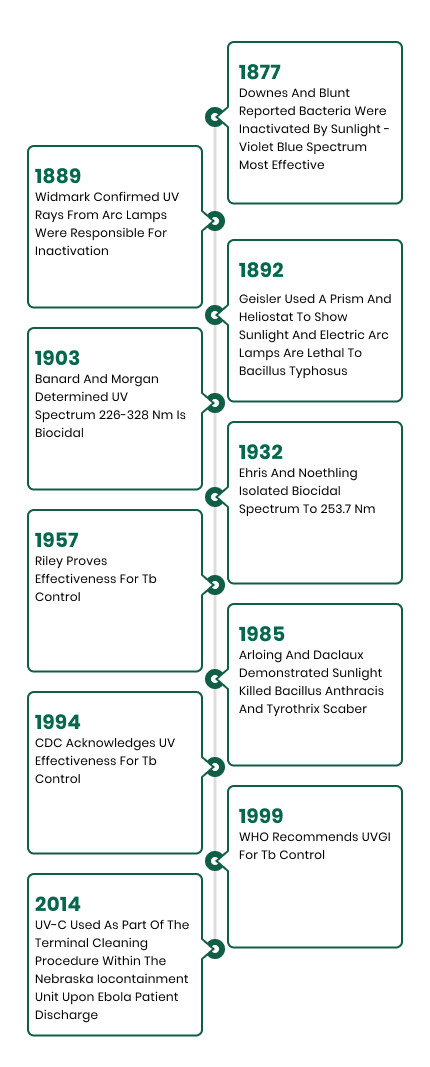 For the past 100 years, science has recognized the bactericide effects of the ultraviolet area of the electromagnetic spectrum. Below are some key contributions over the years: